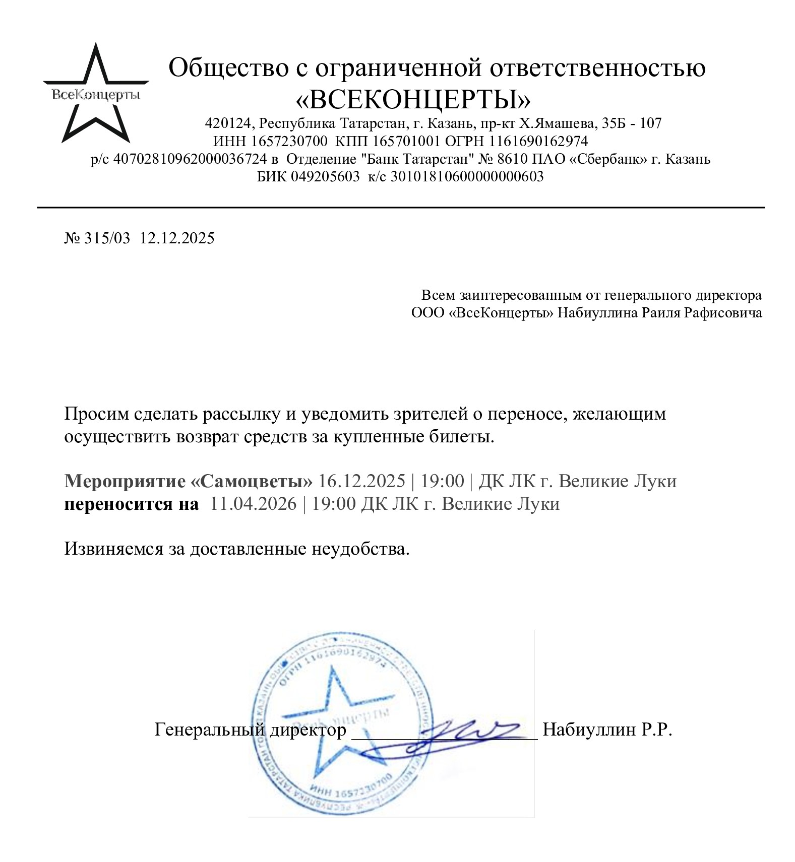 Уважаемый клиент! Спешим сообщить, что по информации, полученной от организатора, концерт группы «Самоцветы», запланированный на 16 декабря 2025 года в 19:00 в Доме культуры Ленинского Комсомола, перенесён на 11 апреля 2026 года, начало в 19:00. Ранее приобретенные билеты действительны на новую дату, обменивать их не нужно. Если вам неудобно посетить концерт в новую дату, вы можете вернуть билет по кнопке в личном кабинете во вкладке «Заказы» (до 25 декабря 2025 года включительно). Деньги за электронные билеты вернутся автоматически в полном объёме на карту, с которой была произведена оплата. Если вы купили билет в кассе Ticketland.ru за наличный расчет, то обратитесь, пожалуйста, на почту: vozvrat@ticketland.ru. С уважением, команда поддержки Ticketland.