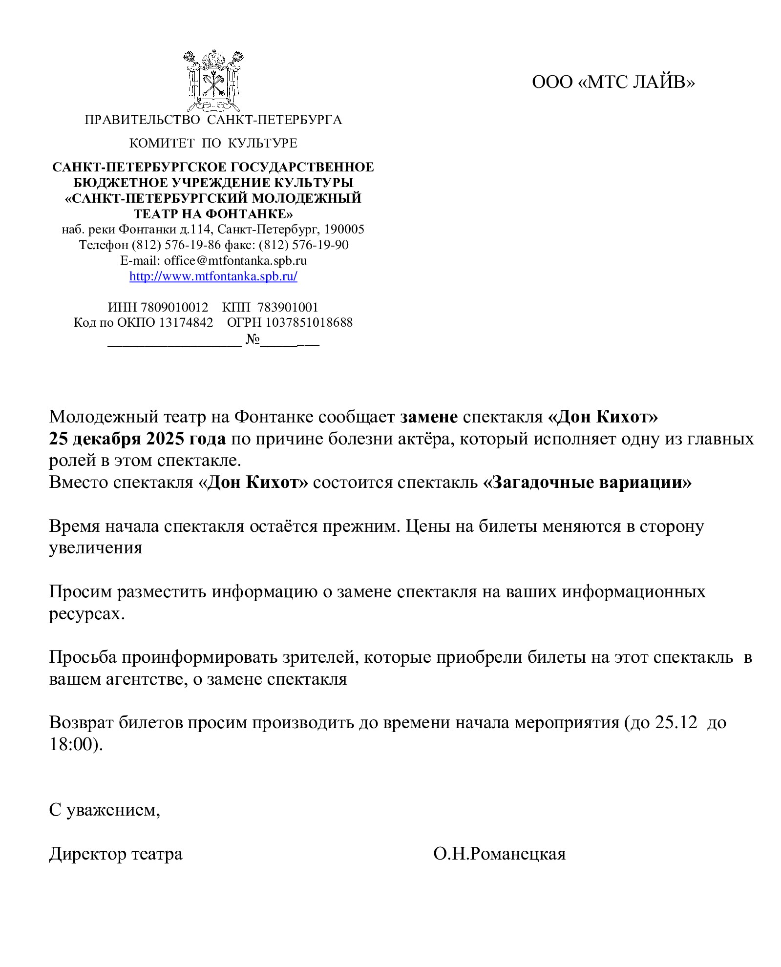 Уважаемый клиент! Спешим сообщить, что по информации, полученной от организатора, спектакль «Дон Кихот», запланированный на 25 декабря 2025 года в 19:00 в Молодёжном театре на Фонтанке, заменён на спектакль «Загадочные вариации». Ранее приобретенные билеты действительны на новый спектакль, обменивать их не нужно. Если вы не хотите посетить новый спектакль, вернуть билет можно по кнопке в личном кабинете во вкладке «Заказы». Деньги за электронные билеты вернутся автоматически в полном объёме на карту, с которой была произведена оплата. Если вы купили билет в кассе Ticketland.ru за наличный расчет, то обратитесь, пожалуйста, на почту: vozvrat@ticketland.ru. С уважением, команда поддержки Ticketland.