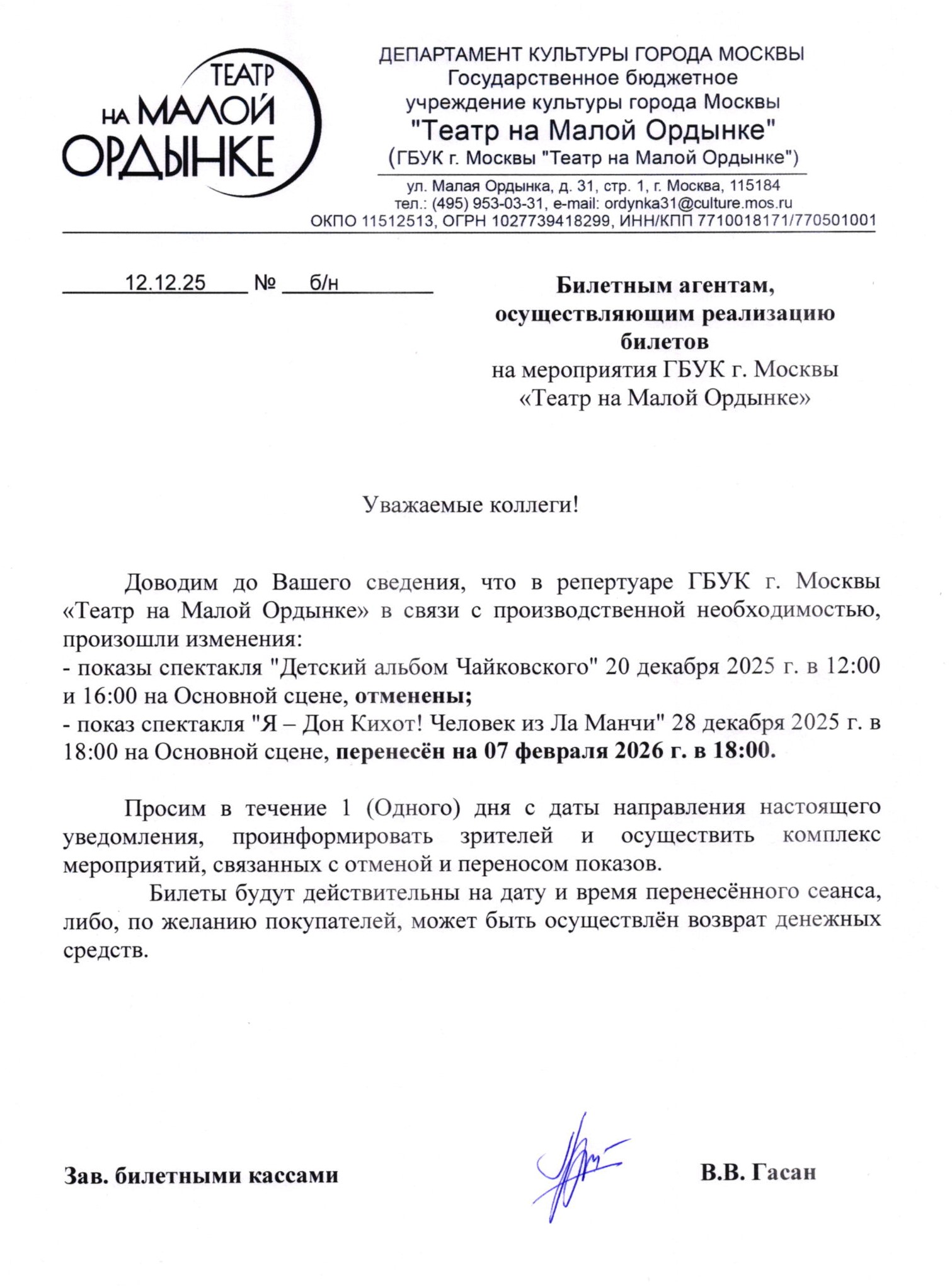 Уважаемый клиент! Спешим сообщить, что по информации, полученной от организатора, спектакль «Я – Дон Кихот! Человек из Ла Манчи» запланированный на 28 декабря 2025 года в 18:00 в Театре на Малой Ордынке, перенесён на 7 февраля 2026 года, начало в 18:00. Ранее приобретенные билеты действительны на новую дату, обменивать их не нужно. Если вам неудобно посетить спектакль в новую дату, вы можете вернуть билет по кнопке в личном кабинете во вкладке «Заказы» (до 31 декабря 2025 года включительно). Деньги за электронные билеты вернутся автоматически в полном объёме на карту, с которой была произведена оплата. Если вы купили билет в кассе Ticketland.ru за наличный расчет, то обратитесь, пожалуйста, на почту: vozvrat@ticketland.ru. С уважением, команда поддержки Ticketland.