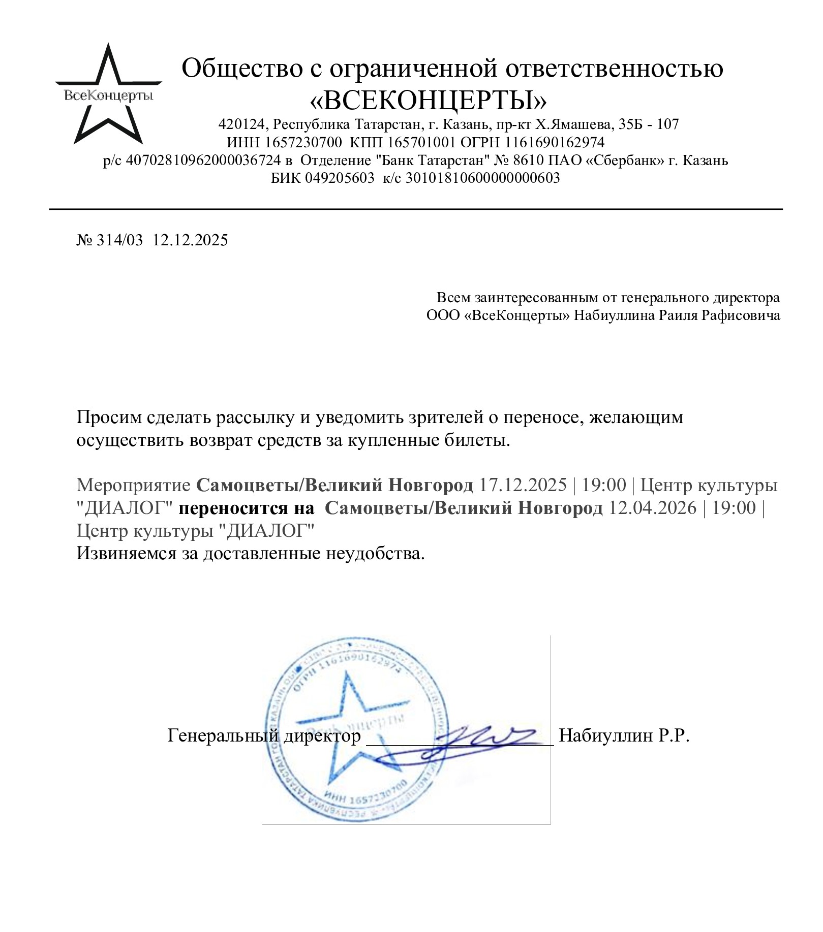 Уважаемый клиент! Спешим сообщить, что по информации, полученной от организатора, концерт группы «Самоцветы», запланированный на 17 декабря 2025 года в 19:00 в Центре культуры «Диалог», перенесён на 12 апреля 2026 года, начало в 19:00. Ранее приобретенные билеты действительны на новую дату, обменивать их не нужно. Если вам неудобно посетить концерт в новую дату, вы можете вернуть билет по кнопке в личном кабинете во вкладке «Заказы» (до 25 декабря 2025 года включительно). Деньги за электронные билеты вернутся автоматически в полном объёме на карту, с которой была произведена оплата. Если вы купили билет в кассе Ticketland.ru за наличный расчет, то обратитесь, пожалуйста, на почту: vozvrat@ticketland.ru. С уважением, команда поддержки Ticketland.