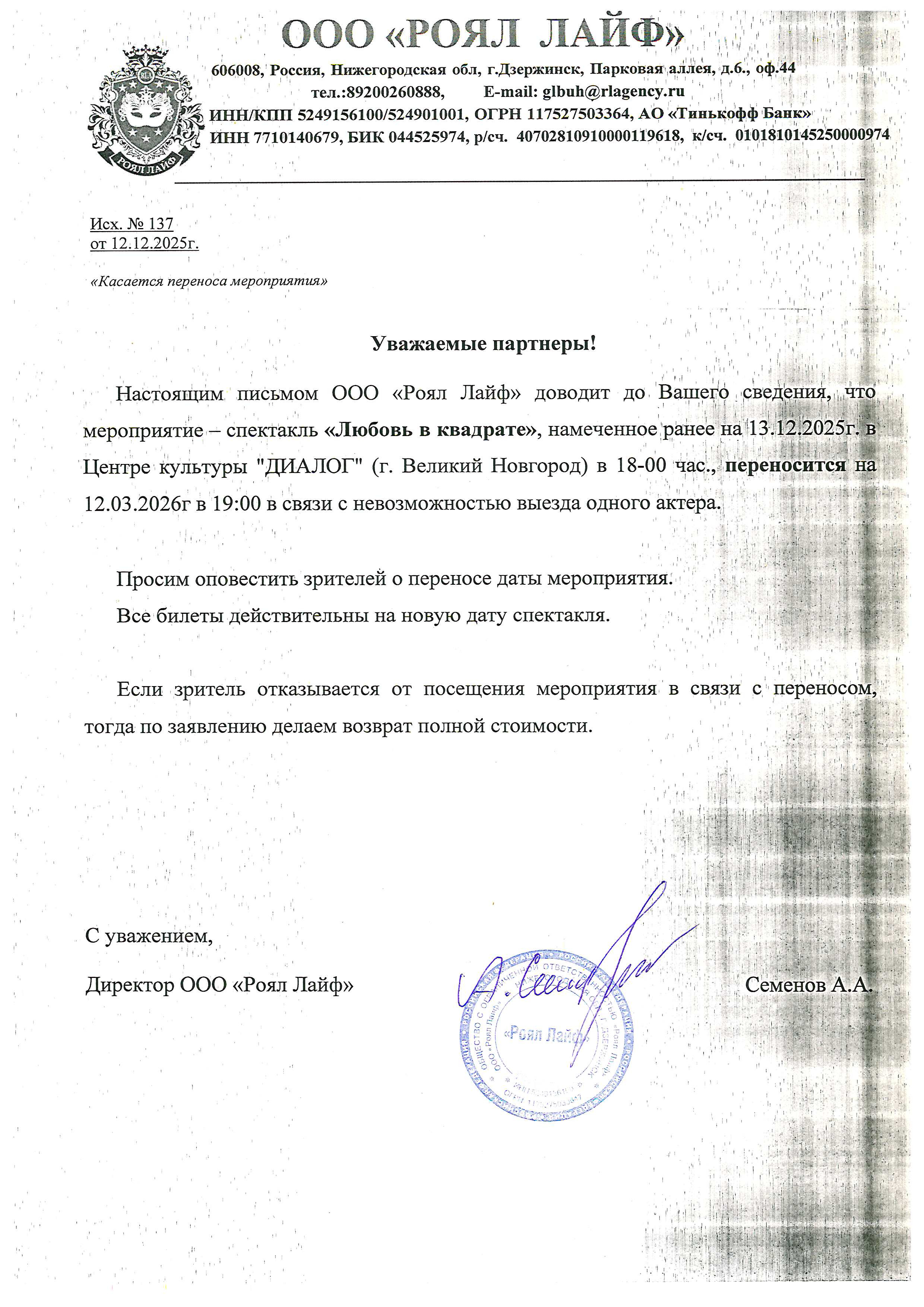 Уважаемый клиент! Спешим сообщить, что по информации, полученной от организатора, спектакль «Любовь в квадрате», запланированный на 13 декабря 2025 года в 18:00 в Центре культуры «Диалог», перенесён на 12 марта 2026 года, начало в 19:00. Ранее приобретенные билеты действительны на новую дату, обменивать их не нужно. Если вам неудобно посетить спектакль в новую дату, вы можете вернуть билет по кнопке в личном кабинете во вкладке «Заказы» (до 31 декабря 2025 года включительно). Деньги за электронные билеты вернутся автоматически в полном объёме на карту, с которой была произведена оплата. Если вы купили билет в кассе Ticketland.ru за наличный расчет, то обратитесь, пожалуйста, на почту: vozvrat@ticketland.ru. С уважением, команда поддержки Ticketland.