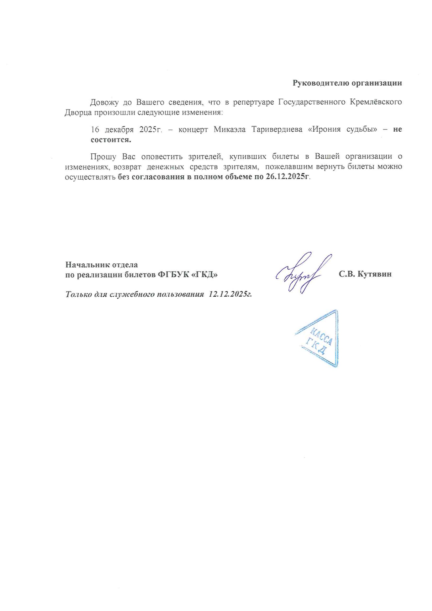 Уважаемый клиент! Спешим сообщить, что по информации, полученной от организатора, концерт «Микаэл Таривердиев «Ирония судьбы» (Возможна телесъёмка), запланированный на 16 декабря 2025 года в 19:00, отменен. Деньги за электронные билеты вернутся автоматически в полном объёме на карту, с которой была произведена оплата. Если вы купили билет в кассе Ticketland.ru за наличный расчет, то обратитесь, пожалуйста, на почту: vozvrat@ticketland.ru. С уважением, команда поддержки Ticketland.