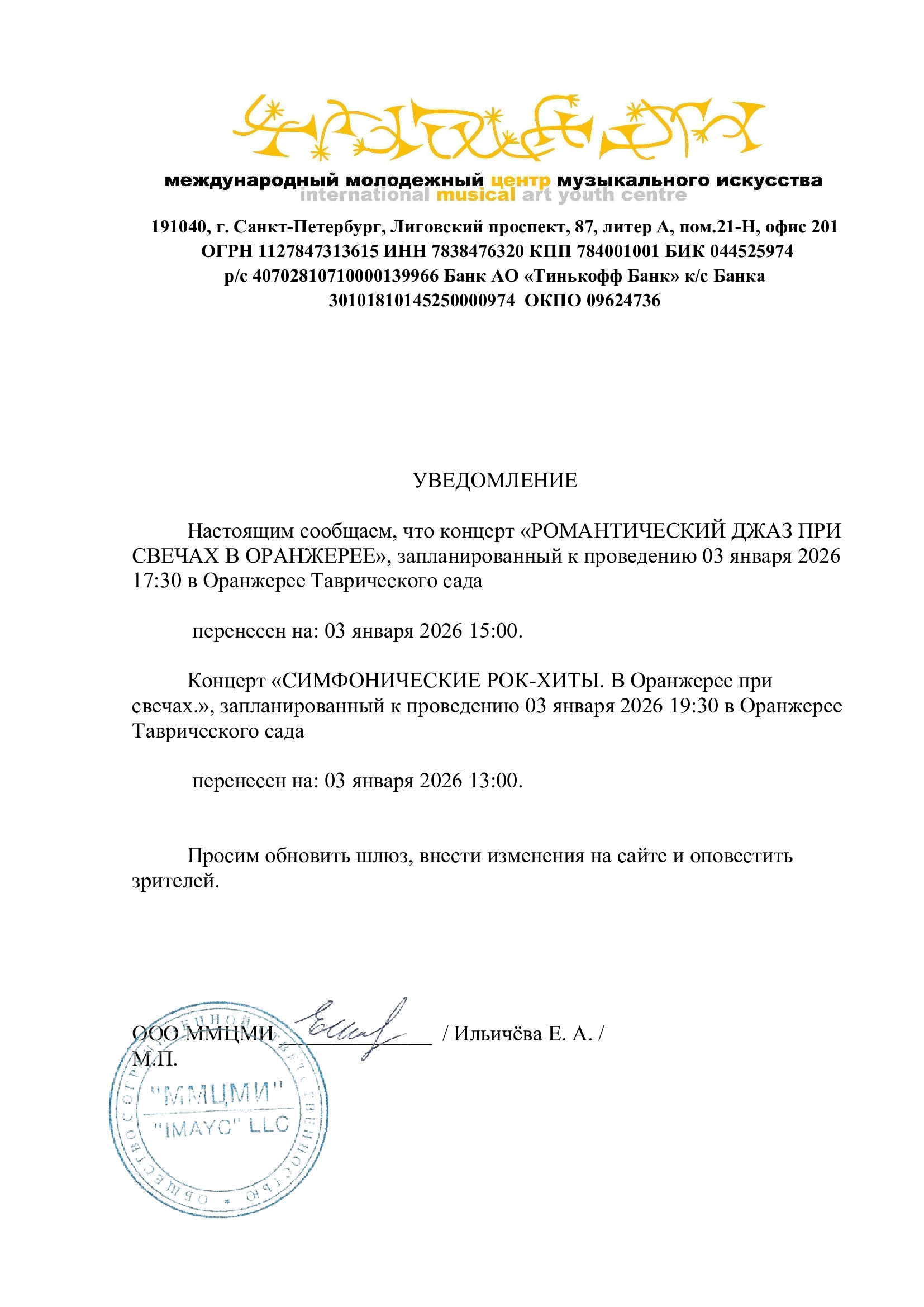 Уважаемый клиент! Спешим сообщить, что по информации, полученной от организатора, концерт «Романтический джаз при свечах», запланированный на 3 января 2026 года в 17:30 в Оранжерее Таврического сада, перенесён на 15:00. Ранее приобретенные билеты действительны на новое время, обменивать их не нужно. Если вам неудобно посетить концерт в новое время, вы можете вернуть билет по кнопке в личном кабинете во вкладке «Заказы». Деньги за электронные билеты вернутся автоматически в полном объёме на карту, с которой была произведена оплата. Если вы купили билет в кассе Ticketland.ru за наличный расчет, то обратитесь, пожалуйста, на почту: vozvrat@ticketland.ru. С уважением, команда поддержки Ticketland.