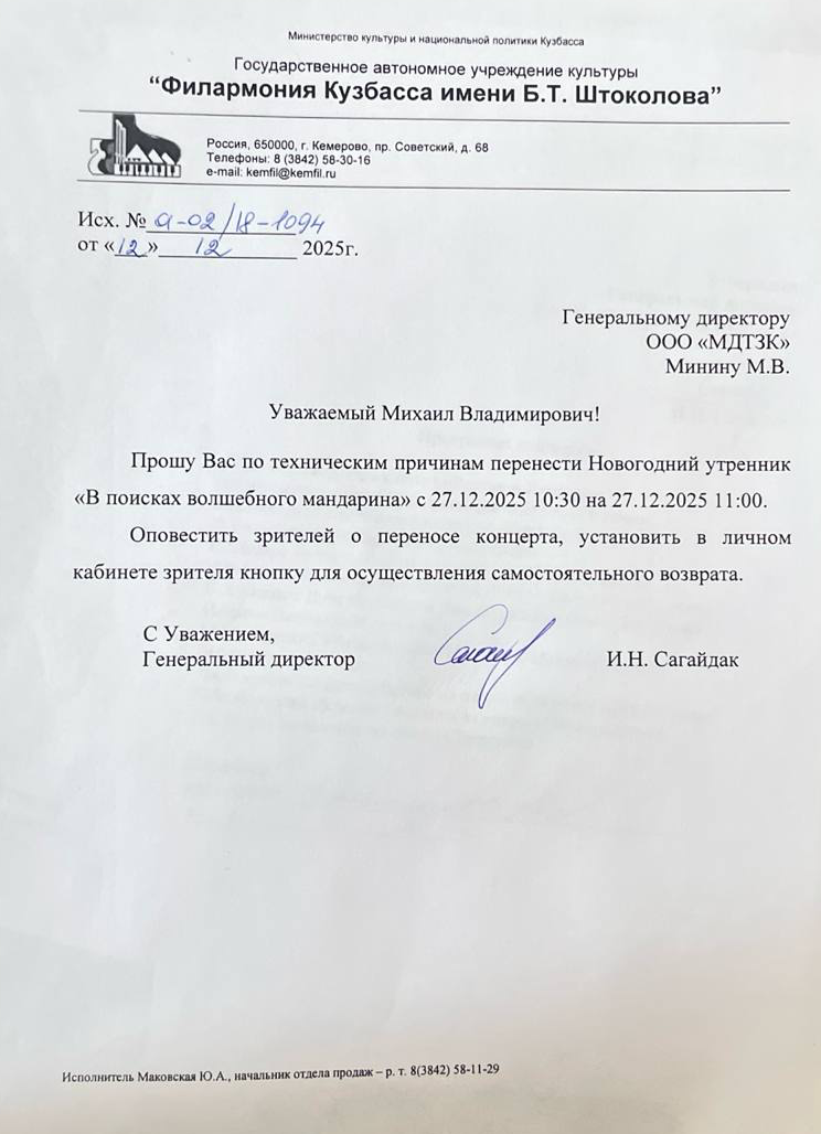 Уважаемый клиент! Спешим сообщить, что по информации, полученной от организатора, Новогодний утренник «В поисках волшебного мандарина», запланированный на 27 декабря 2025 года в 10:30 в Филармони Кузбасса, перенесён на пол часа вперёд. Верное время начала новогоднего утренника в 11:00. Ранее приобретенные билеты действительны на новое время, обменивать их не нужно. Если вам не удобно посетить мероприятие, вы можете вернуть билет по кнопке в личном кабинете во вкладке «Заказы». Деньги за электронные билеты вернутся автоматически в полном объёме на карту, с которой была произведена оплата. Если вы купили билет в кассе Ticketland.ru за наличный расчет, то обратитесь, пожалуйста, на почту: vozvrat@ticketland.ru. С уважением, команда поддержки Ticketland.