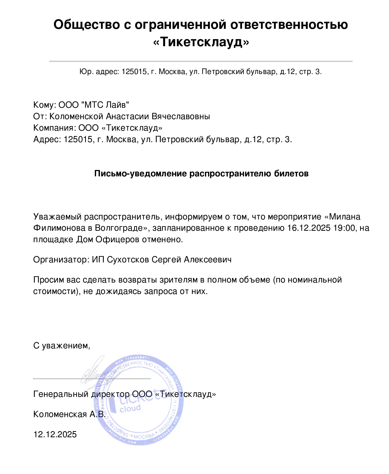 Уважаемый клиент! Спешим сообщить, что по информации, полученной от организатора, концерт Миланы Филимоновой, запланированный на 16 декабря 2025 года в 19:00 в Доме офицеров, отменён. Деньги за электронные билеты вернутся автоматически в полном объёме на карту, с которой была произведена оплата. Если вы купили билет в кассе Ticketland.ru за наличный расчет, то обратитесь, пожалуйста, на почту: vozvrat@ticketland.ru. С уважением, команда поддержки Ticketland.